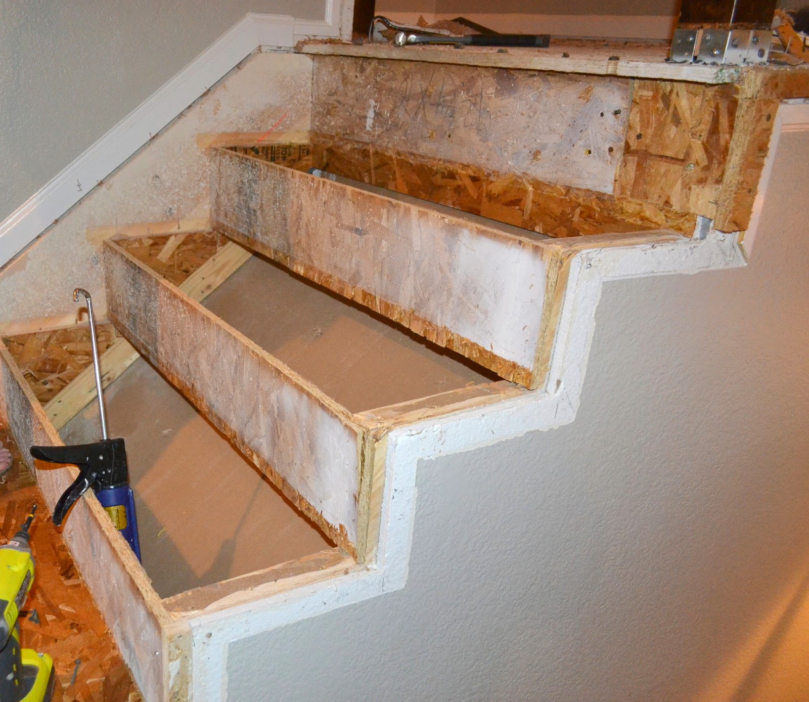 We used red oak retreads from Lowe’s- 42 Inch. We made the risers using 1/2 inch MDF sheets cut to size and painted before application. On trim edges we used the trim pieces that are pre-manufactured to match the retreads.