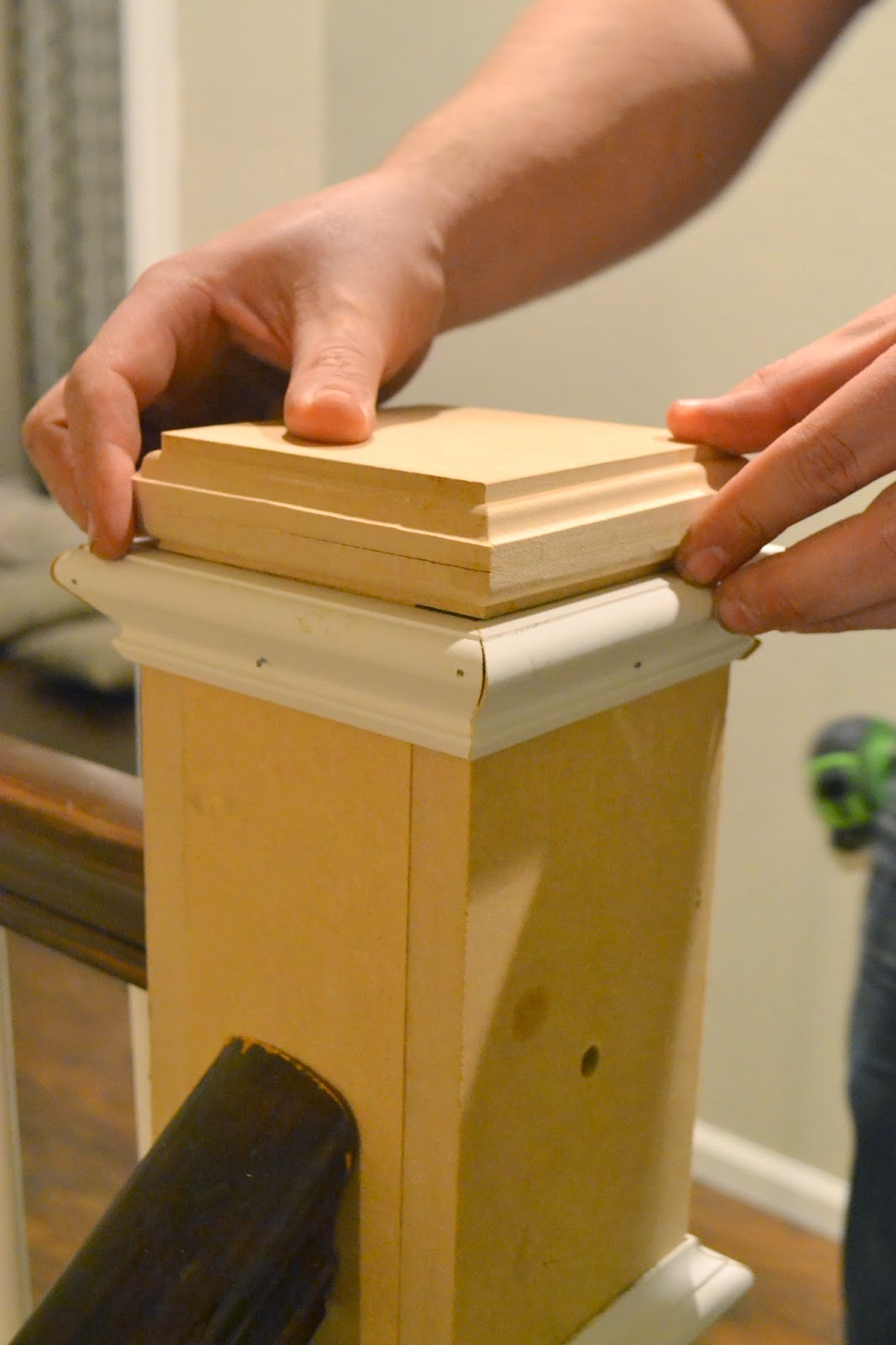 My husband Trenton wrapped the existing newel posts in 3/4 inch MDF and decorated the posts with two different types of trim and filled all cracks with wood filler. Then he sanded, primed, and painted the posts for a chunkier façade.