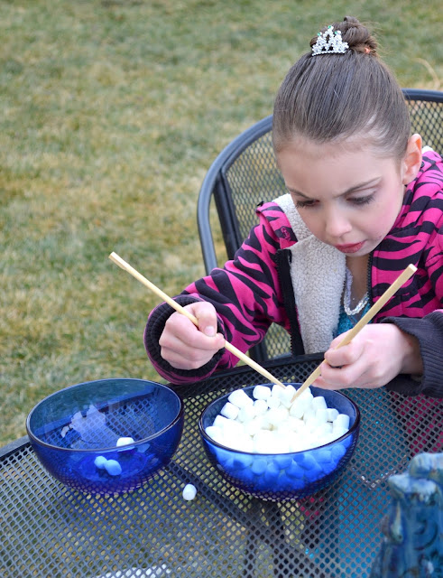 One of the games the girls played was to move as many marshmallows (snowballs) from one bowl to another using chopsticks. Whoever moved the most snowballs in 3 minutes won the game. It’s trickier than it looks!