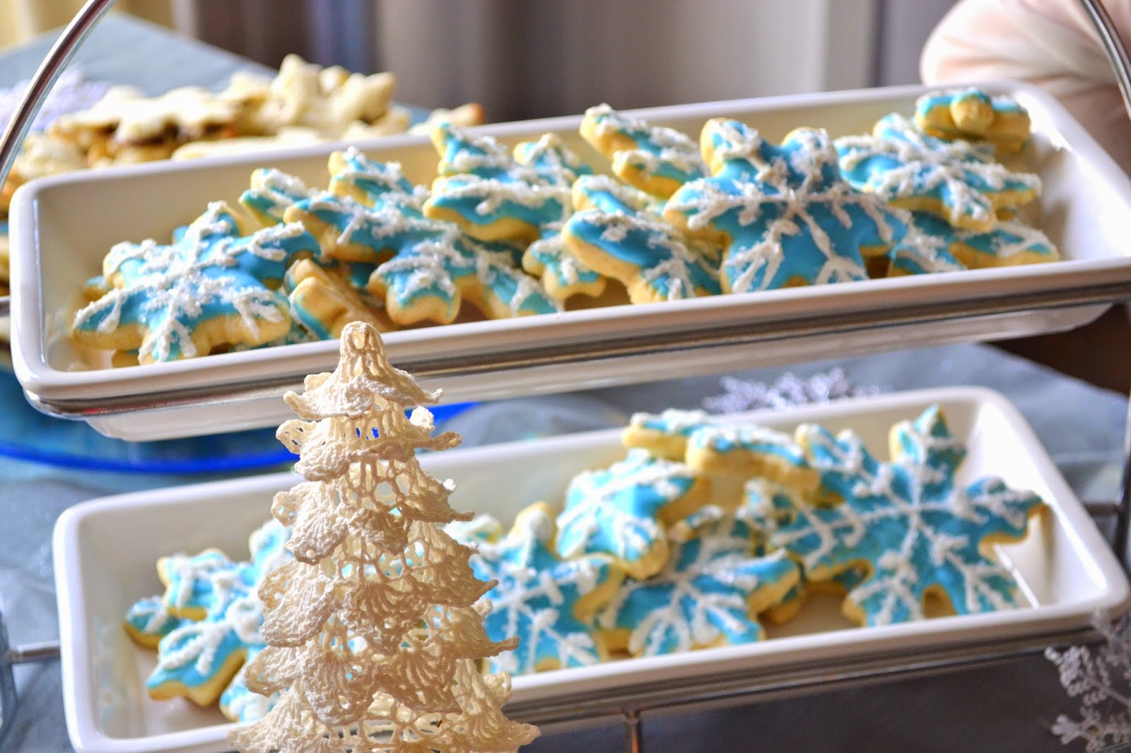 For the sugar cookies, I followed this recipe from Brown Eyed Rose. I cut out the cookies with a snowflake shaped cutter and then iced the cookies with blue and white melting chocolates. The chocolate does a beautiful job of keeping the cookies soft, and of course, it tastes delicious.
