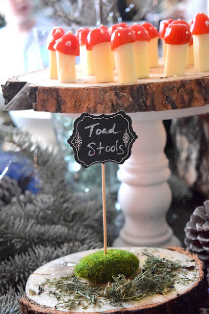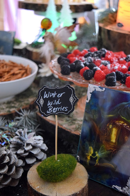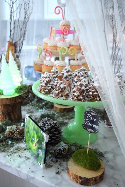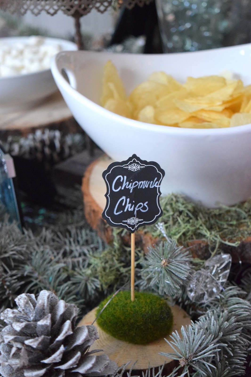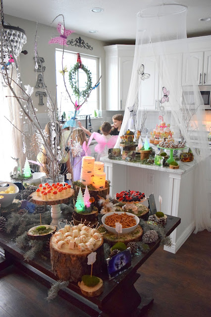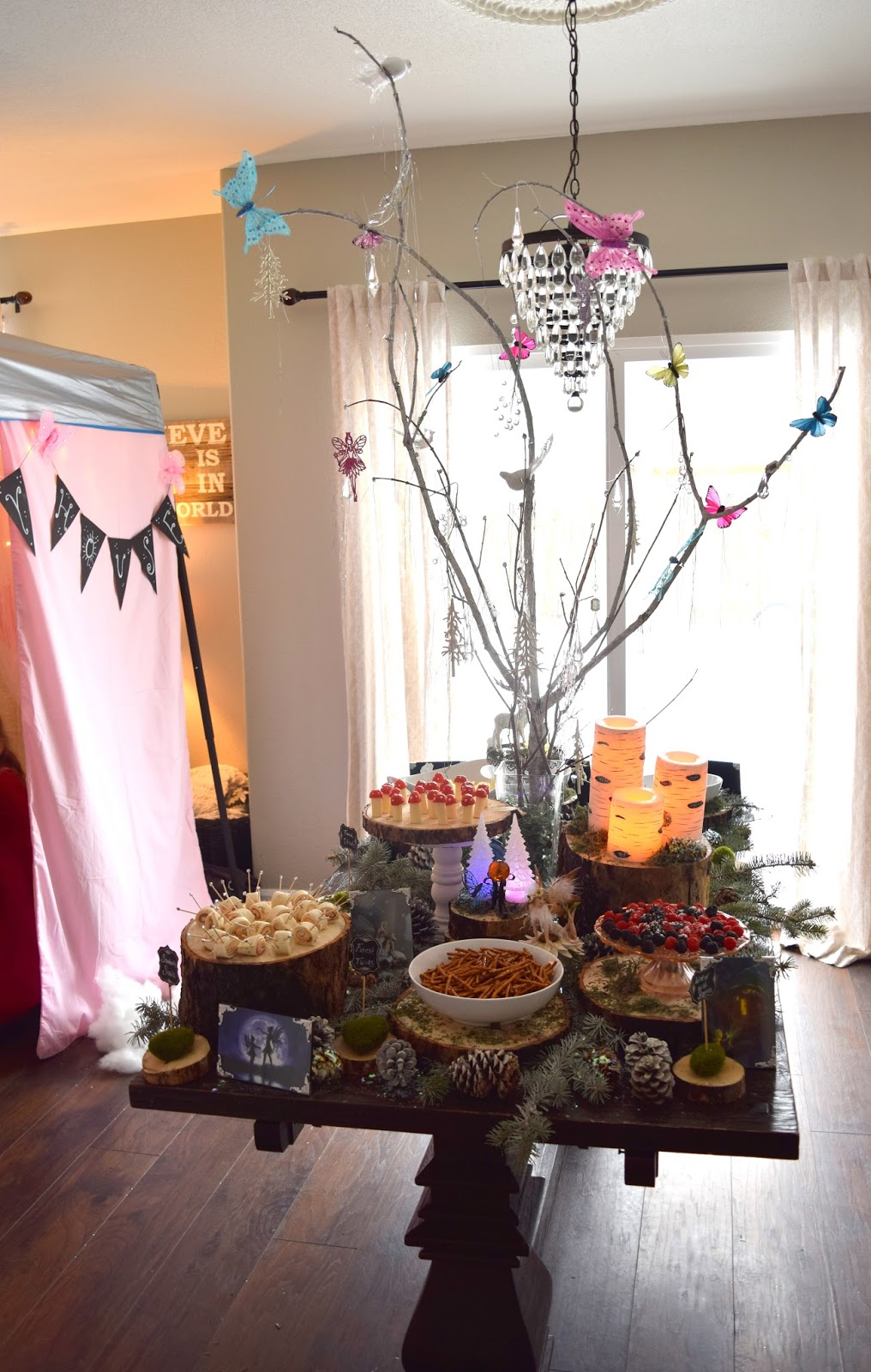 For the food table, I cut some slow hanging branches from a spruce tree and also sprayed them with fake snow and layered them across the table, instead of using a tablecloth. My husband cut a few logs that we had into perfect woodland serving platters, and I hung the net that Emma usually has over her bed above the island, for a dreamy effect.