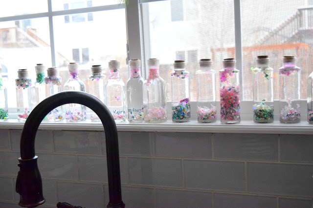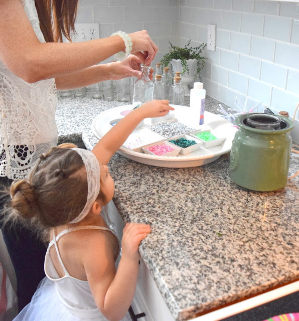 For the party favors, each girl got to make her own bottle of “Pixie Dust.” I found the bottles, 50% at Hobby Lobby. To make these, you just need an assortment of sparkles and waterproof confetti, about 1 teaspoon liquid glycerin (which you can find in the soap-making section of any craft store), water, and melted wax, to seal the bottles.