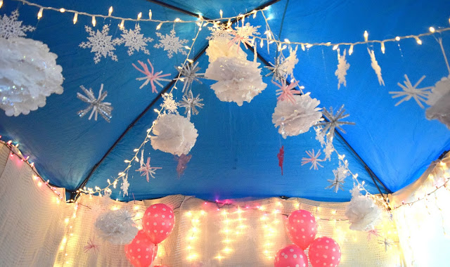 Considering that we had an intense Colorado snowstorm going on outside, our first priority was to create a comforting, warm space inside our home for all the pretty fairies to play. To do this, we moved our couches out to the garage and set up a camping pavilion in our family room. Then we draped it with blankets and sheets to enclose it, and added lights and decorations to create a glowing little fairy tent.