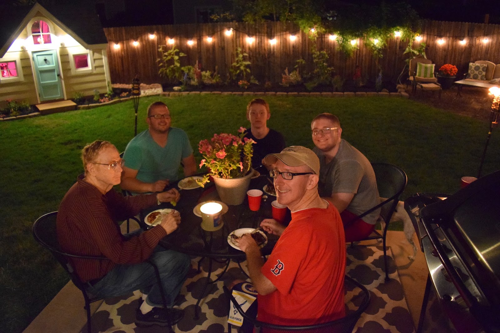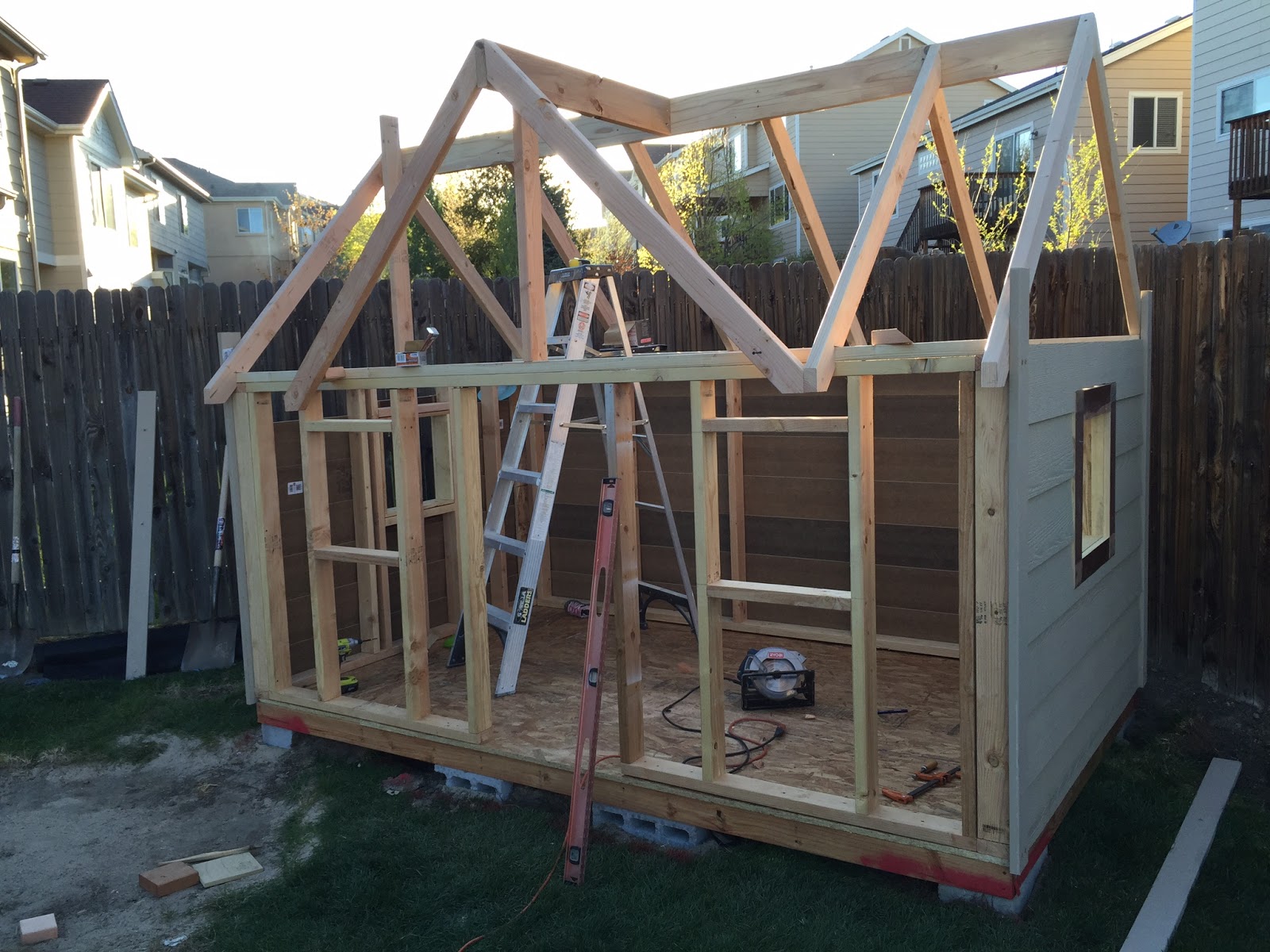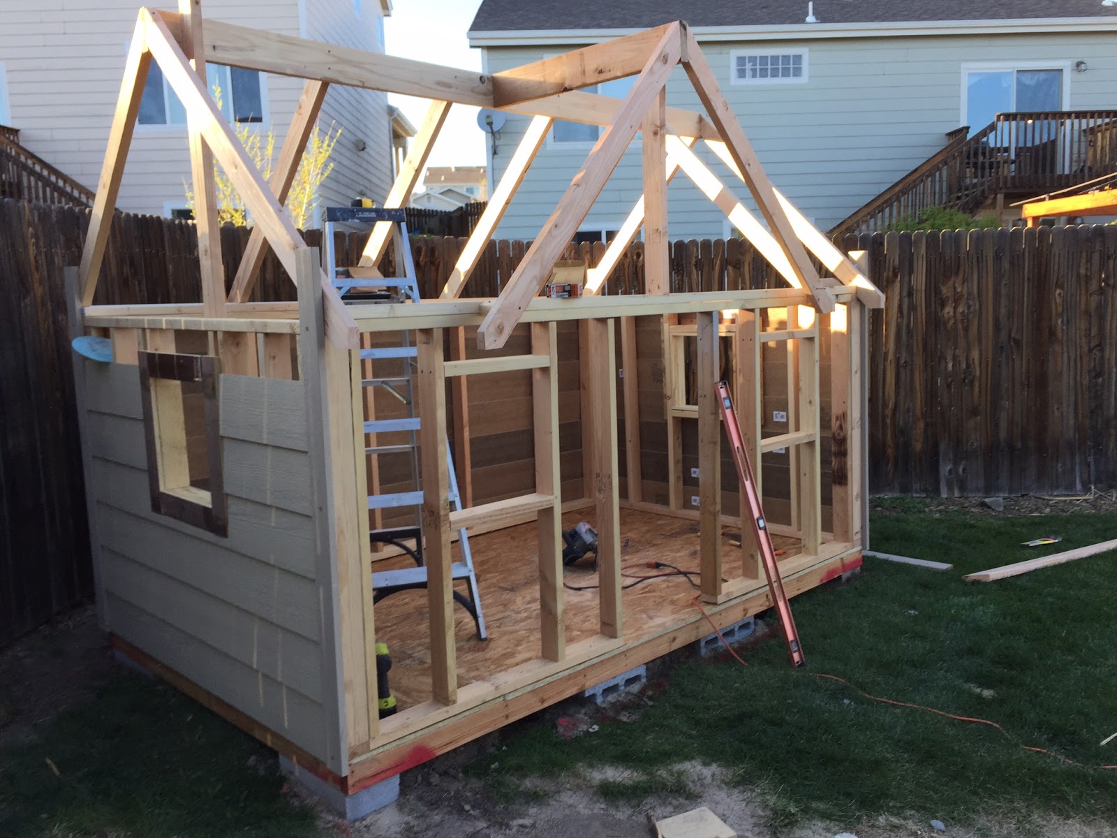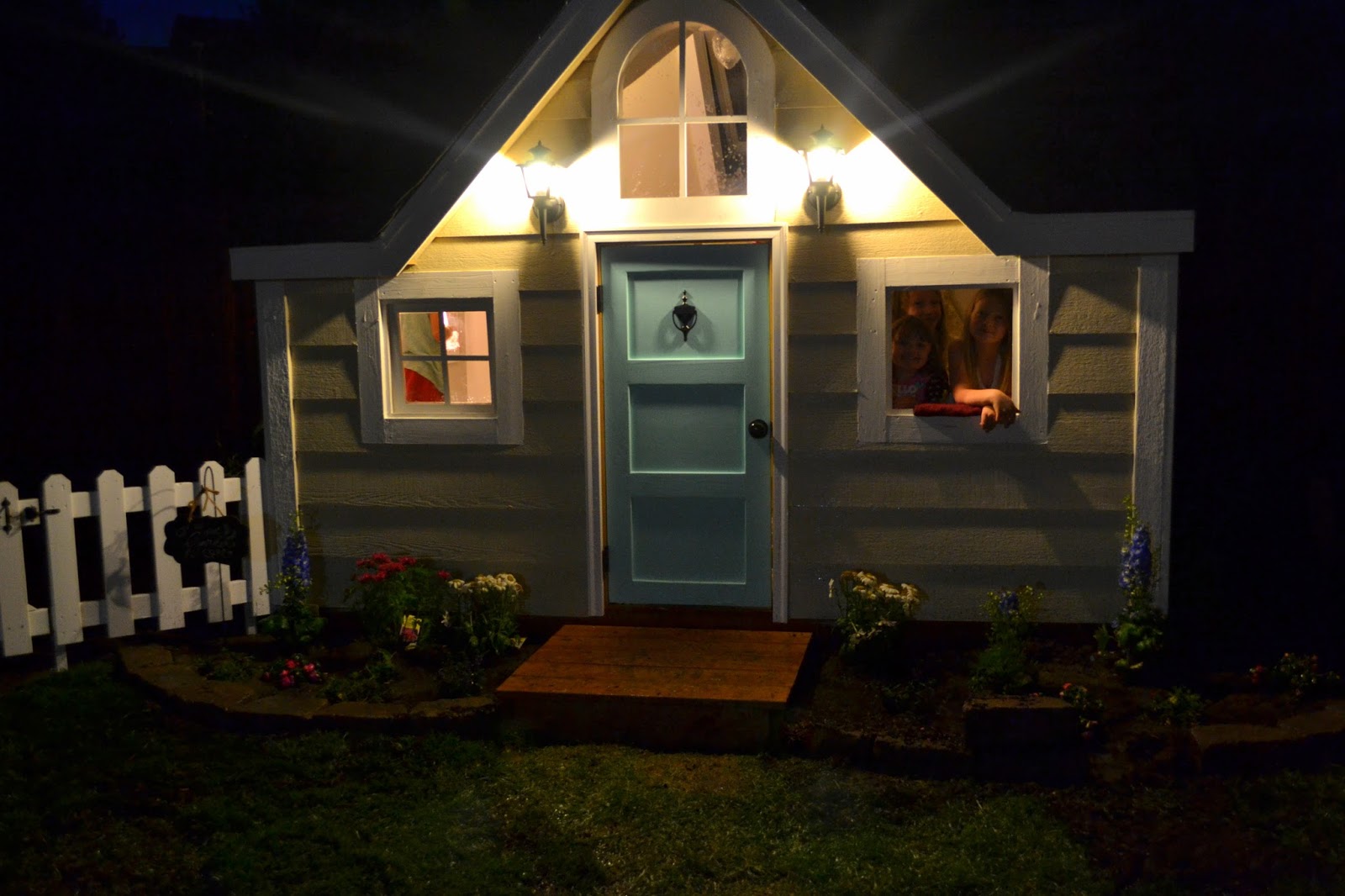 We did our best to repurpose as much of the old wood as possible. We used the rails of the existing fort to make the garden fence, and old lumber from the second floor to build the windows, trim, and casing. To do this, a lot of time was spent cutting each piece to size and sanding. The rest of the house was built using 2 x 4 construction on a pressure treated base, which was set on cinder blocks that were leveled into the ground. The house has a 3/4 inch sub-floor, OSV sheeting for the roof and 3D asphalt shingles. We recycled and restored a velux skylight to allow more natural light to shine in. All the windows and the door are handmade with standard 3 inch hinges, which were customized to use a ball catch. We have a GFI in our garage for the electrical, and then we used direct bury UF cable in a 12 inch trench to meet code. We used a 20 A circuit and 12-2 with ground to wire the inside. Thankfully we have a neighbor and good friend that is a professional electrition, and we was so kind in offering his help and knowledge. Don’t you just love wonderful people? Because really, what’s a house without light? For the interior we used 1/2 inch drywall and fiberglass insulation, and knock-down texture right out of the can. The kids were so helpful along the way, and Trenton was good to pass his carpentry knowledge on to them. I had fun searching thrift stores and garage sales for items to fix up and decorate with. This house truly was a labor of love- as friends stepped up and offered help, supplies, and even flowers to contribute to the garden. We made some new friends through the process, which is the ultimate perk of taking on a project like this. I hope we live here long enough for our grandbabies to play in it.