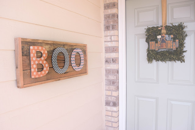 I used hard cardboard letters from the craft store to spell out the word, “BOO.” Wood letter would work too. This is where the craft really gets fun because you can choose any word for any holiday and the variety of craft paper is endless. Simply trace and cut the letter out and Mod Podge the paper over the letter. Be sure to cover the entire letter with the glue so that it seals and protects it from the elements.